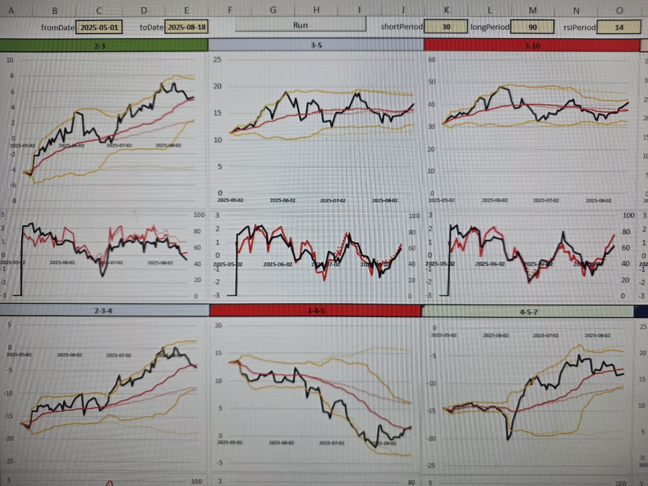 - 위 그래프: 검은선=스프레드, 빨간선=SMA, 노란선=볼린저밴드
