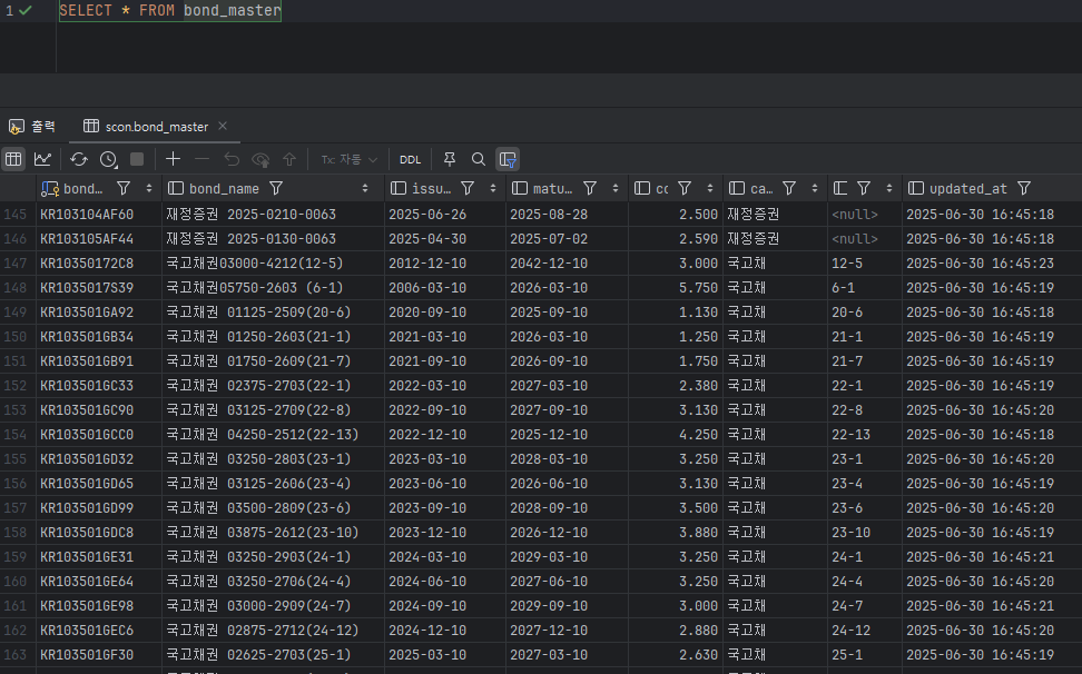 여기서 전체 국고 종목을 Excel로 다운받고 우측에 약칭 + 중분류를 수기로 매핑 후 BOND_MASTER 테이블에 넣어놓는다.