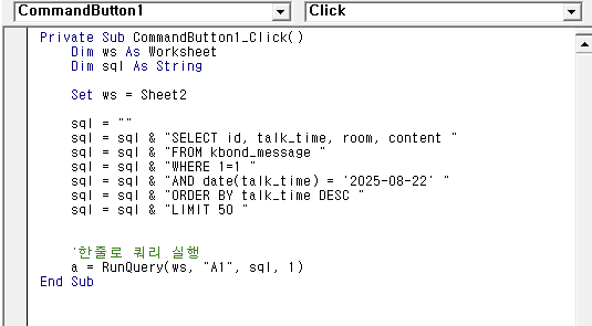 python으로 못하는 것은 없다만,업무 자동화 영역에서 엑셀은 여전히 강력한 도구다. 데이터 가공 및 시각화에는 엑셀이 가공과 수정이 쉬워 python보다 훨씬 공수가 적게 든다.특히 버튼 하나만 누르면 데이터베이스에서 실시간으로 데이터를 조회해서 보고서가 갱신되는 구조는 생산성을 비약적으로 높여준다. 문제는 DB연동하여 기능을 구현하는게 은근히 번거롭다.매 시트마다 Connection 객체를 만들고, 루프 돌려서 셀에 하나하나 출력하는 반복적인 작업이 필요했다.DB연동을 활용한 시트가 많아지고 쿼리가 복잡해지다보니중간에 DB 접속 주소, ID/PW가 바뀔 일이 있었는데 엑셀 시트마다 교체하려니까 환장하겠더라. 그래서 아예 한 줄로 끝나는 SQL 조회 함수를 만들었다.한 번 만들어두니 이후로는 복붙만 ..